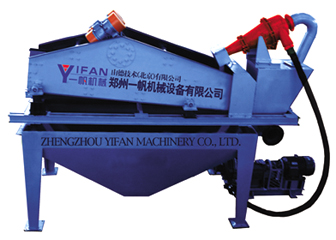 2. Working principle: The compound of sand and water is transported to cyclone, the sand that centrifugal classification concentrate provided to the vibrating screen by the heavy grit, sand and water are effectively separate after vibrating screen dehydration. Through Recycling Box, fine sand and mud and so on returned again to the pool, then are exhausted from the exit when the liquid surface of pool is too high. The material weight concentration recovered by the vibrating screen is 70%- 85%. Adjusting fineness module may come true by changing pulp concentration, adjusting the flooding water yield, changing the grit mouth, then fulfilling its three kinds function-washing, dehydration and screening.